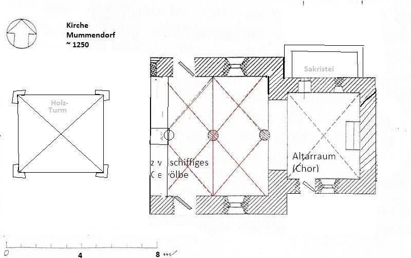 Ursprünglich hatte die Kirche in Mummendorf eine Gewölbedecke - so wie sie immer noch im Altarraum erhalten ist. Das ursprünglich quadratische Kirchenschiff (~10x10 Meter) teilte sich in vier Kreuzrippengewölbe, die durch eine Mittelsäule und die Wandanschlüsse getragen wurde. Diese neue gotische Bautechnik setzte sich Anfang des 12.Jahrhunderts durch und erlaubte es, meist dreischiffige Kirchenhallen in fast beliebiger Größe zu bauen. Aber auch für zweischiffige bot es sich an. Man musste allerdings die Säulen in der Mitte des Kirchenschiffs in Kauf nehmen, die einem die Sicht nehmen konnte.
