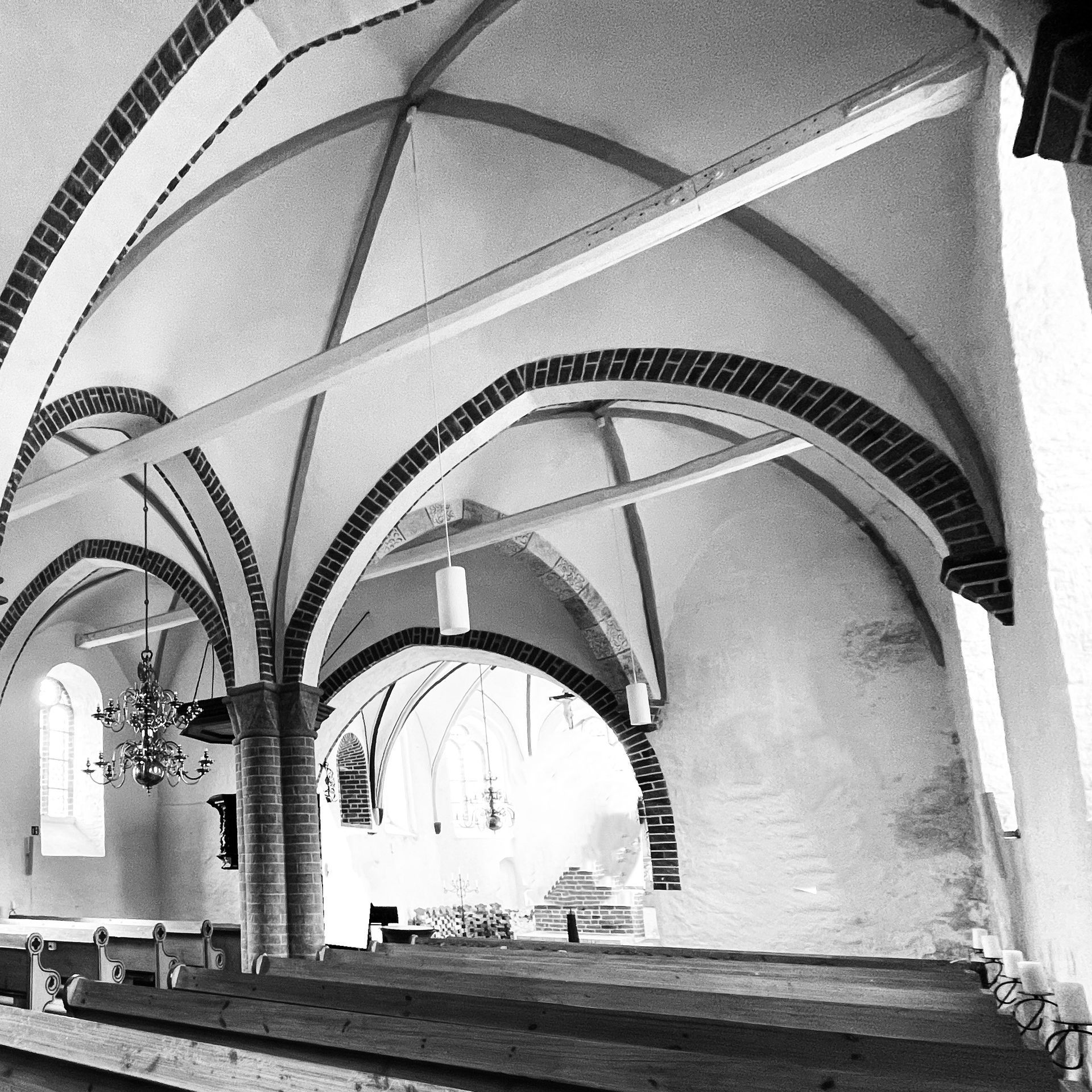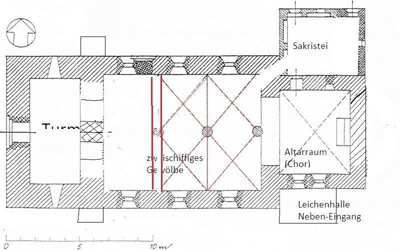 - Das anfänglich quadratische Kirchenschiff mit dem Kreuzrippengewölbe wurde im Rahmen einer Erweiterung der Kirche abgerissen und durch eine hölzerne Flachdecke ersetzt. (siehe unten)