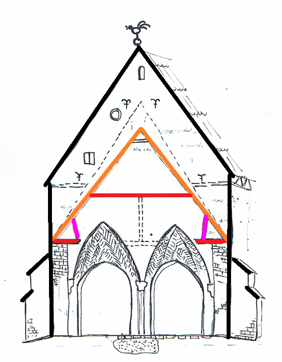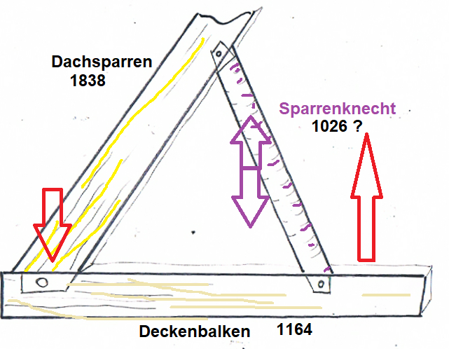 Es ist offensichtlich, dass die drei Balken nachträglich (innerhalb der letzten 200 Jahre) eingesetzt wurden. Wie wann und warum die „Sparrenknechte“ dort eingefügt wurden, ist zu erforschen.