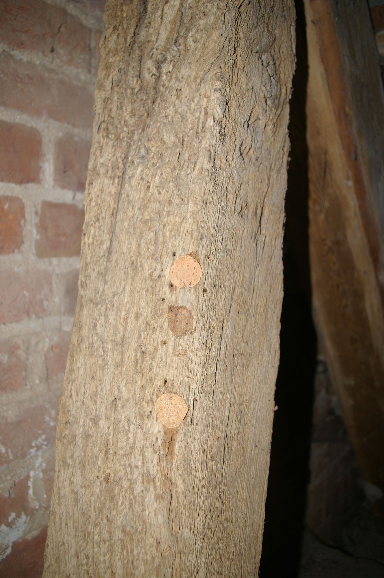 Es ist offensichtlich, dass sie zuvor anderen Zwecken gedient hatten. Mindestens einer war zuvor eine Diagonalstütze in einer Fachwerkaußenwand, was man an den Auskerbung für eine Überblattung sieht. Bei den anderen handelt es sich offensichtlich um Teile von Ästen: Der Anteil von Splintholz ist extrem hoch, was man am Wurmfraß unschwer erkennen kann.