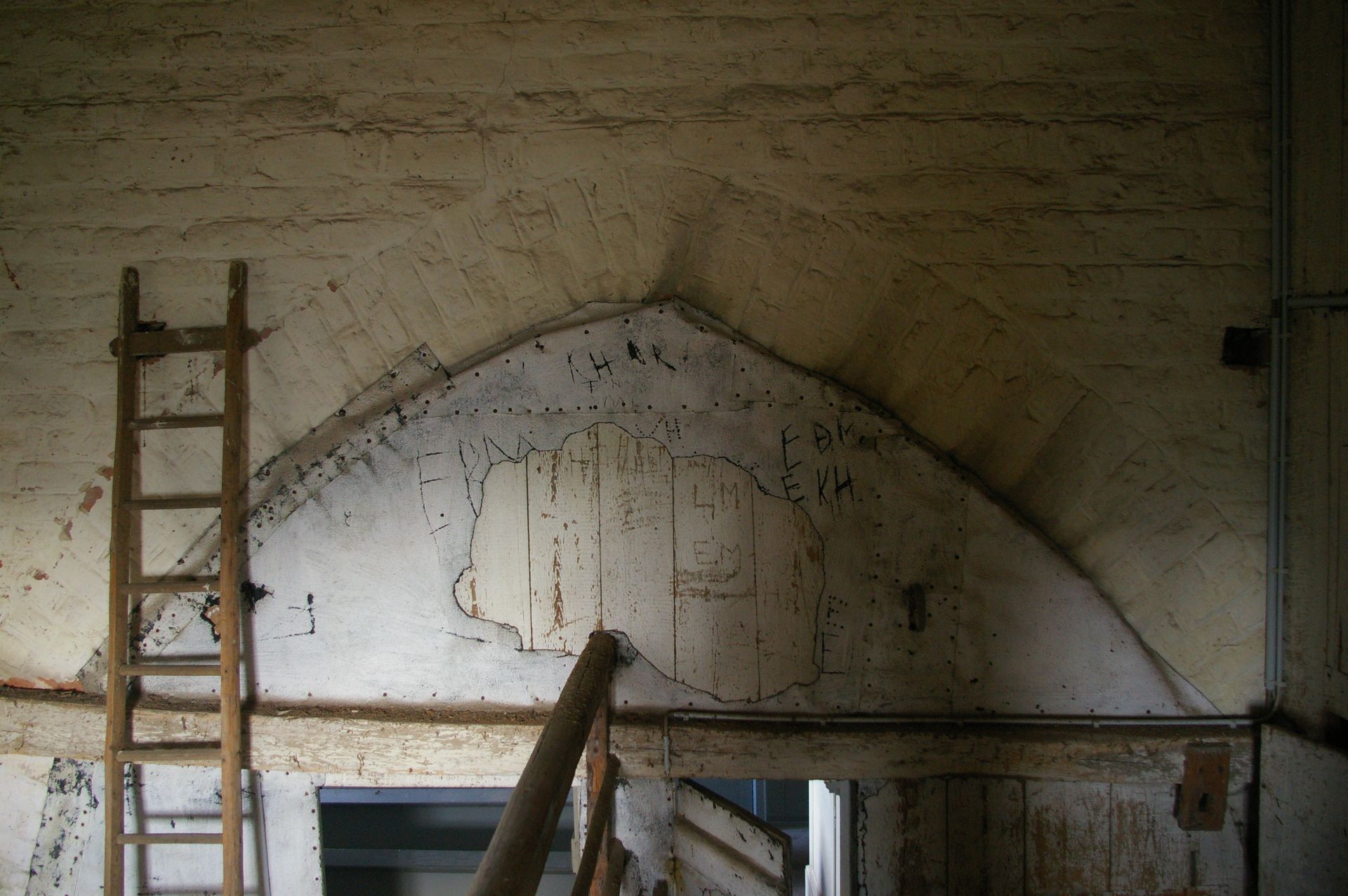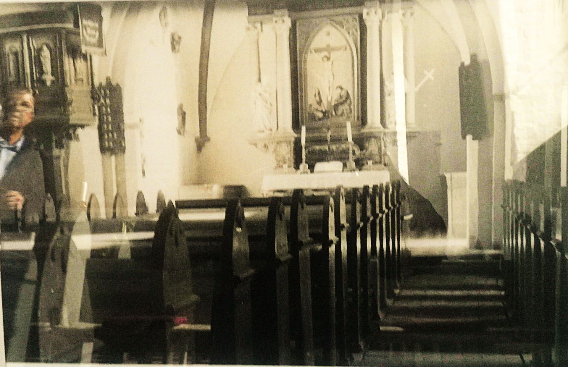 - Der Bereich das Turmes wurde zum Eingangsbereich umfunktioniert. Die großen gotischen Rundbögen zum Kirchenschiff hin wurden mit Holzbrettern geschlossen und mit Teerpappe verkleidet.